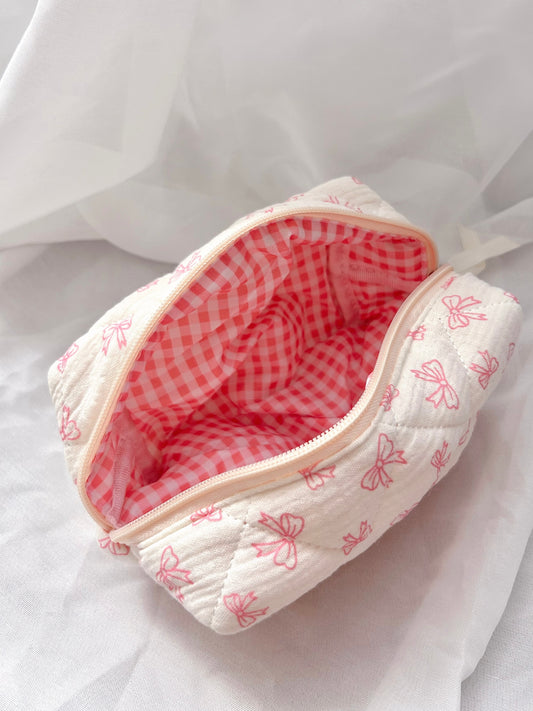 Cream Bow Quilted Cosmetic Bag